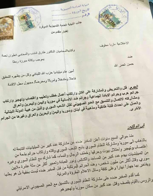 در شکایت ماریا معلوف که روز جمعه 24 مارس 2017 در رسانهها منشتر شد، آمده است که این شکایت علیه حسن نصرالله و هر کس دیگری که تحقیقات نشان دهد، مجری، مرتبط، شریک یا آمر جنایتهای کشتار بوده و در عملیات آدمربایی، شکنجه، تجاوز جنسی، آواره کردن مردم، جنایتهای جنگی، کشتار دستهجمعی و جنایت علیه بشریت در سوریه، یمن، بحرین و عراق مشارکت داشته، تنظیم شده است.