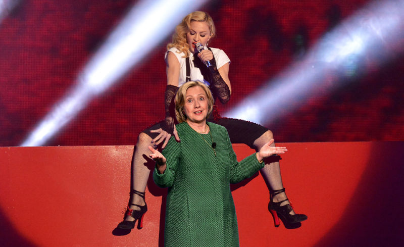 مدونا خواننده ي مردمي و از جان و خان و مان گذشته طي يك حركت تبليغاتي براي جمع كردن راي براي هيلاري كلينتون لخت شده، هرچند او يك عمري ست لخت است و معلوم نيست دقيقن چه چيزي را درآورده اما دستش هم درد نكند، حالا شانس آن ترامپ بدبخت است كه آرنولد كله كاندومي برايش لخت مي شود
